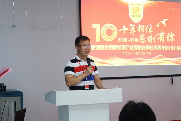 十岁了,回望激情燃烧的岁月,展望美好蓬勃的未来。起跑线上的纠结,因为不甘平庸与胸怀大志的亲密接触;行动力,因为努力化身汗水相邀起舞;辉煌,因为创新鞭笞着脚步引吭高歌。今天你就是主角——龙图腾!Today you are the hero! 十年风雨兼程,十年光辉历程,在这个成长的过程中,少不了广大客户的支持与厚爱。在风景秀丽的大蜀山脚下,创新高地上的龙图腾公司10周年庆生派对开始啦! 庆典开始总经理刘光致辞,龙图腾始于2008年的创业,十年来龙图腾在规模、人员、营收、技术及服务都发生了很大的变化。十年过去了,我们龙图腾的努力还在,激情还在,梦想还在。对于未来规划落点孵化项目IPTOP,致力于打造集专利咨询、检索、管理、培训为一体的综合性服务门户,同时兼顾“慧问”教育培训管理平台、“妈妈秘籍”育婴咨询服务系统,坚定不移的拥护创新入骨。