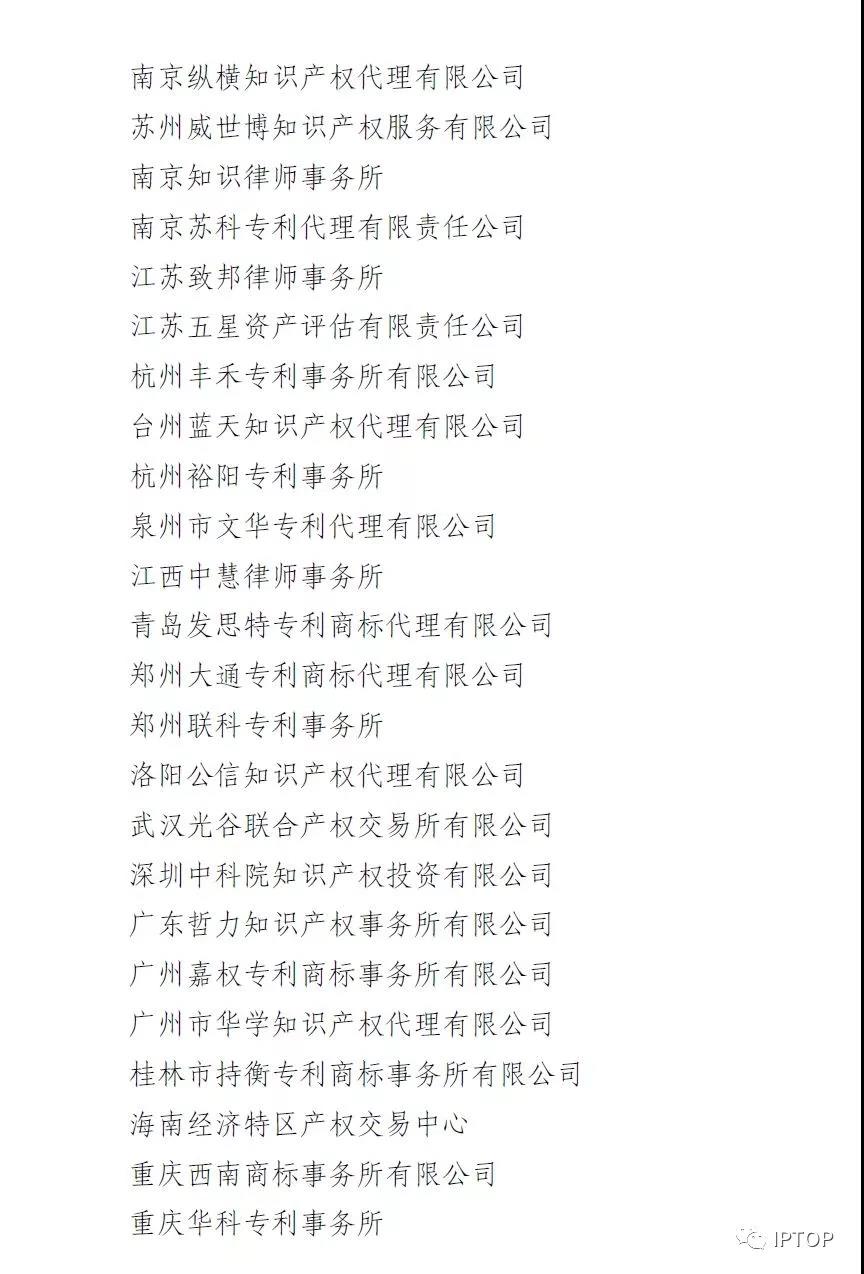 北京知产宝网络科技发展有限公司 北京知识产权运营管理有限公司 北京集慧智佳知识产权管理咨询股份有限公司 北京林达刘知识产权代理事务所(普通合伙) 中国商标专利事务所有限公司 中宇恒泰(北京)地理标志科技有限公司 九州海原科技(北京)有限公司 天津市北洋有限责任专利代理事务所 天津市天元生产力促进有限公司 石家庄众志华清知识产权事务所(特殊普通合伙) 河北国维知识产权咨询有限公司 太原晋科知识产权代理事务所(特殊普通合伙) 沈阳科苑专利商标代理有限公司 长春吉大专利代理有限责任公司 吉林新发知识产权服务有限公司 哈尔滨龙科专利代理有限公司 哈尔滨市伟晨专利代理事务所(普通合伙) 上海市协力律师事务所 上海晨皓知识产权代理事务所(普通合伙) 上海容智知识产权代理有限公司 上海弼兴律师事务所 上海硕力知识产权代理事务所(普通合伙) 南京苏高专利商标事务所(普通合伙) 江苏畅远信息科技有限公司 苏州创元专利商标事务所有限公司 苏州独墅湖科教发展有限公司 杭州天勤知识产权代理有限公司 杭州千克知识产权代理有限公司 合肥市长远专利代理事务所(普通合伙) 合肥智慧龙图腾知识产权股份有限公司 芜湖安汇知识产权代理有限公司 安徽浩智信知识产权代理有限公司 厦门市新华专利商标代理有限公司 江西省子轩科技有限公司 江西清能高科技术有限公司 济南诚智商标专利事务所有限公司 青岛橡胶谷知识产权有限公司 青岛华慧泽知识产权代理有限公司 河南省亿通知识产权服务有限公司 武汉科皓知识产权代理事务所(特殊普通合伙) 长沙朕扬知识产权代理事务所(普通合伙) 东莞市华南专利商标事务所有限公司 广州新诺专利商标事务所有限公司 深圳市中兴达知识产权运营有限公司 广西南宁新创之友知识产权代理有限公司 海口汉普知识产权代理有限公司 重庆强大凯创专利代理事务所(普通合伙) 超凡知识产权服务股份有限公司 四川睿道知识产权服务有限公司 行之知识产权服务集团有限公司 遵义强大博信知识产权服务有限公司 贵阳东圣专利商标事务有限公司 云南滇创科技孵化器企业管理有限公司 陕西丰瑞律师事务所 新疆知信科技有限公司