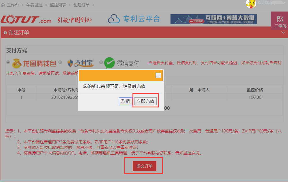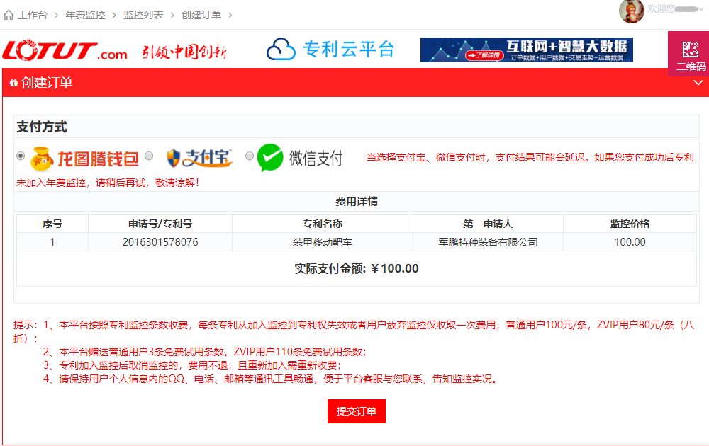 点击加入监控,页面跳转至创建订单页面。选择支付方式,三种支付方式:A 龙图腾钱包、B 支付宝、C 微信支付。再点击提交订单按钮。