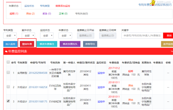1.5 缴纳年费 在监控列表栏目,选择需要缴纳年费的专利,点击缴纳年费按钮。页面跳转至年费缴纳页面。(接下来步骤同专利交费操作)