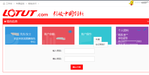 选择 A 龙图腾钱包支付,页面跳转至钱包支付页面,输入正确的支付密码,点击确认付款按钮。
