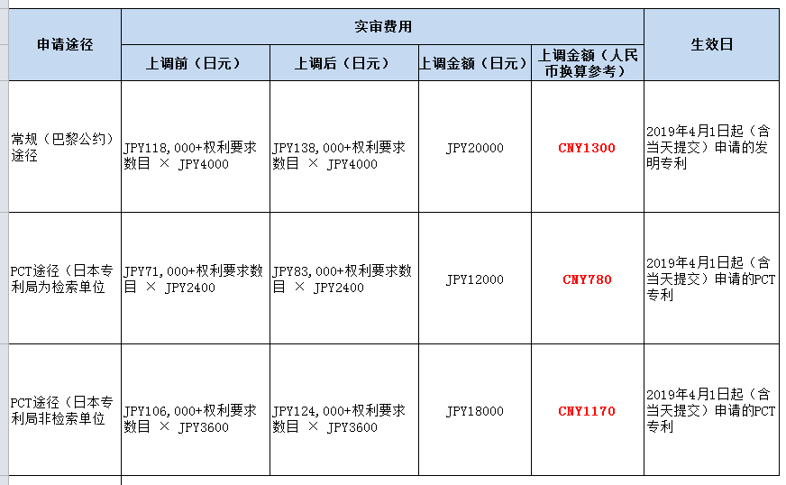 买专利卖专利找龙图腾,真高效! 查专利查商标用IPTOP,全免费!专利年费监控用IP管家,真方便! 据悉,日本专利局自2019年4月1日起将实施新的官方收费标准,发明专利的实质审查费用上调17% 左右。 以下内容摘自日本专利局官网: 日前,日本专利局在其官方网站上公布了日本发明专利实审官费上涨的规定,并将于2019年4月1日起实施,据悉,此次官费上调,主要是为了配合日本《不正当竞争防治法等的部分修改法》以及《不正当竞争防治法等部分修改法中一部分相关政策整顿(以下简称“修改法”)的颁布。自修改法的实施日(2019年4月1日起)以后的实质审查费用详情见下表。 自修改法的实施日(2019年4月1日起)以后的实质审查费用详情见下表。