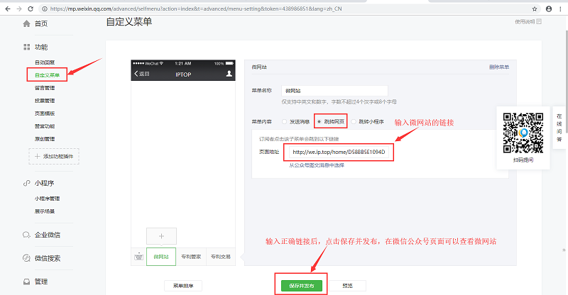 2. 在微信公众号后台,点击功能—自定义菜单。在自定义菜单页面,输入微网站链接,点击保存并发布按钮。保存成功后,可以直接在微信公众号,访问微网站。