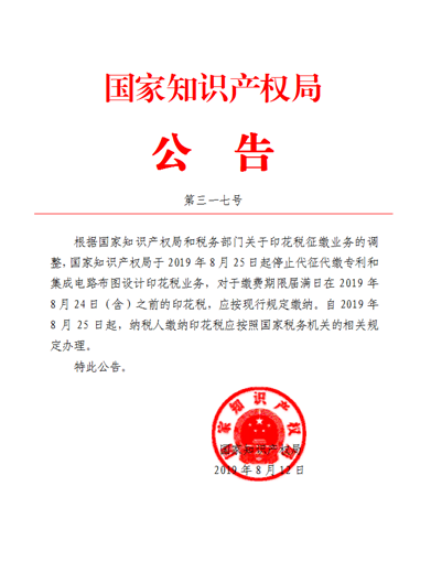 国家知识产权局于2019年8月25日起停止代征代缴专利和集成电路布图设计印花税业务,对于缴费期限届满日在2019年8月24日(含)之前的印花税,应按现行规定缴纳。自2019年8月25日起,纳税人缴纳