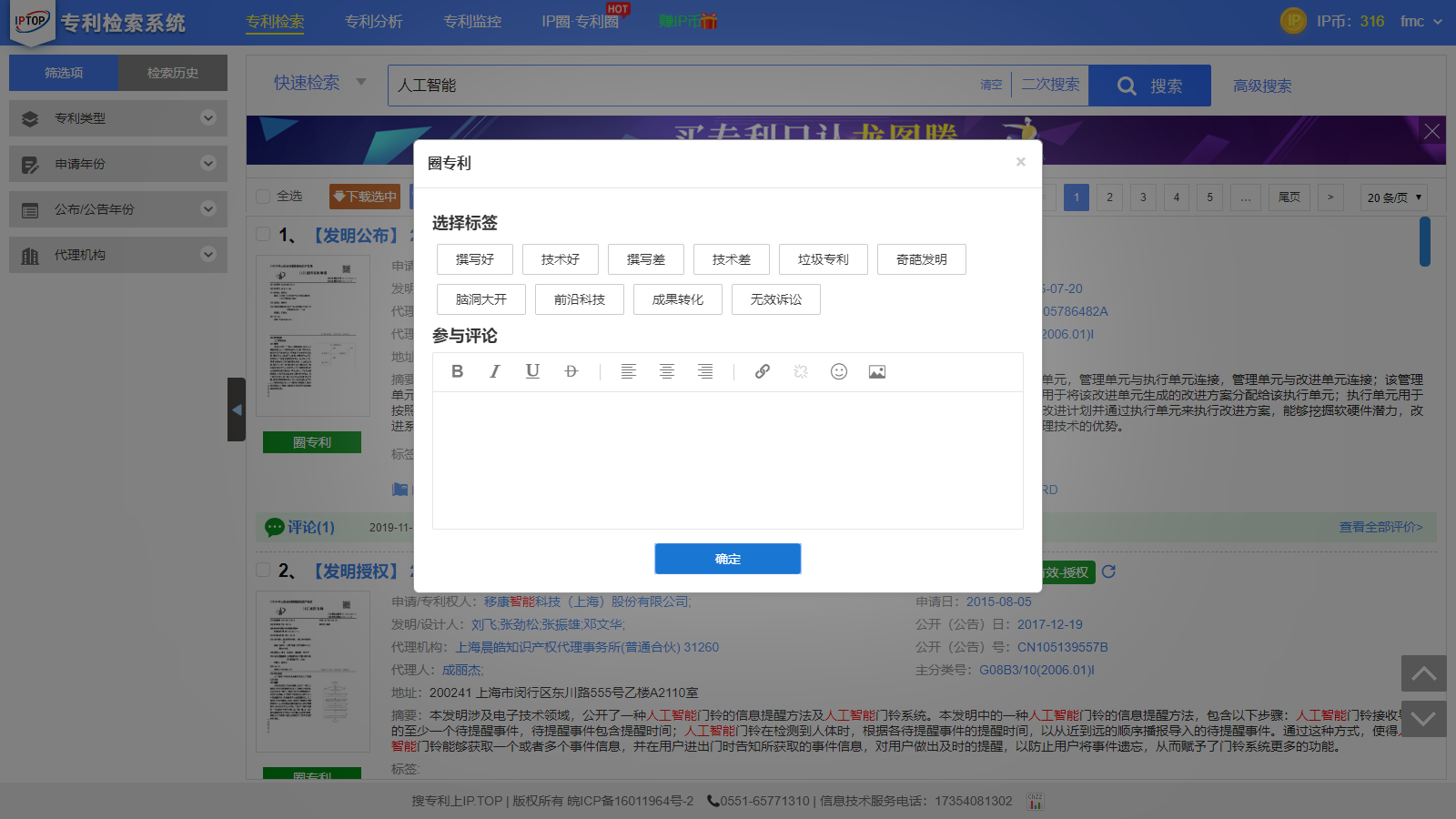四、IP圈·专利圈 专利IP圈·专利圈是IPTOP专利检索平台本年度推出的重点功能之一,点击“圈专利”按钮,即可进入下图界面,在这里你可以畅所欲言,分享你的想法、意见、观点;给专利打标签、评论、点赞等更多新鲜好玩的圈专利方式,尽在IPTOP专利检索平台,快来圈一个呗~~~
