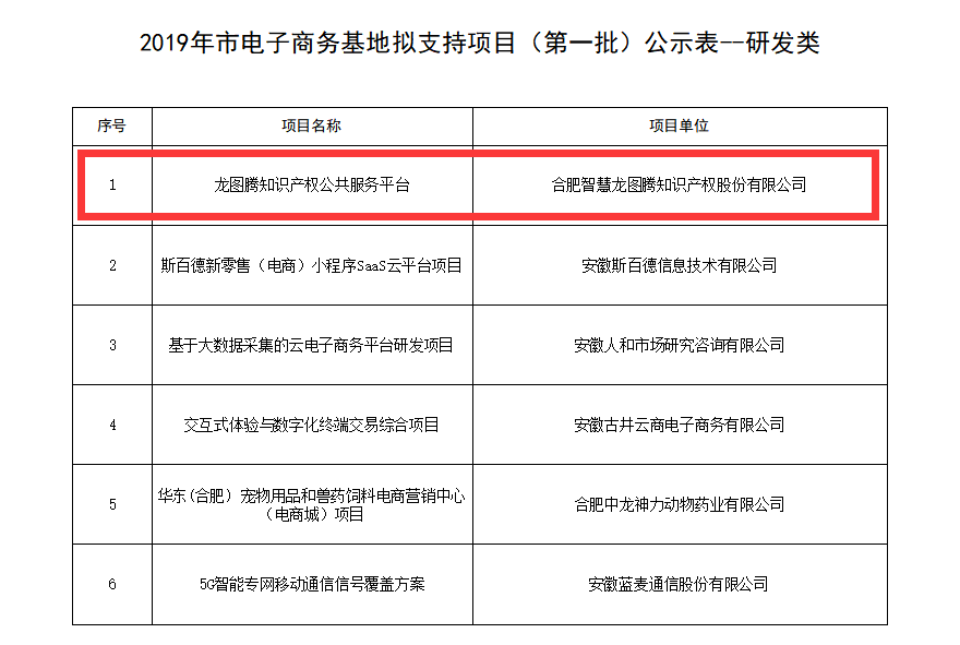 5月26日,蜀山区电子商务战略性新兴产业集聚发展基地建设工作领导小组办公室公示了2019年合肥市蜀山区电子商务产业集聚发展基地专项资金拟支持项目(第一批),龙图腾榜上有名!这不仅是对龙图腾知识产权公共服务平台的支持和肯定,也为龙图腾今后在知识产权电子商务领域持续发展,提供了强大的动力和信心。 龙图腾知识产权公共服务平台是对外开放且免费的平台,是一个以知识产权交易为核心的服务平台,平台将知识产权服务以电子商务的形式,为国内外代理机构提供专业的技术服务。同时在商标专利的交易转移过程中,为知识产权行业增添了活力,帮助用户规范管理专利,对引导知识产权规范有极大的促进作用。