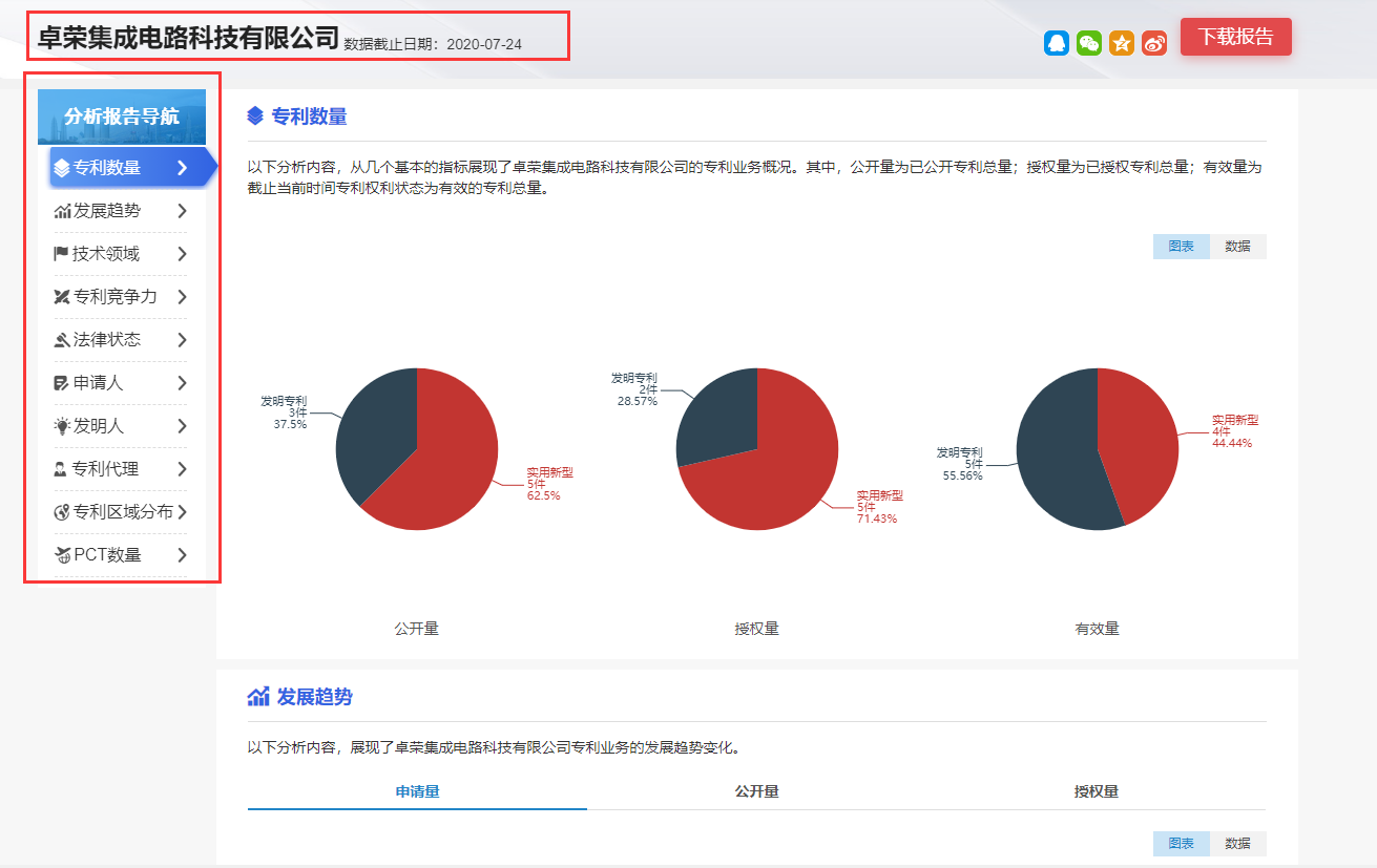 可以看到是对该专利的商标所有权人所有的专利数据进行分析,非常的直观形象,点击右上角的“下载报告”按钮,我们还可以直接下载相关的报告。 “查专利”按钮也是类似的,在此我们就不再赘述了。 我们再看看“名片”按钮会显示什么页面: