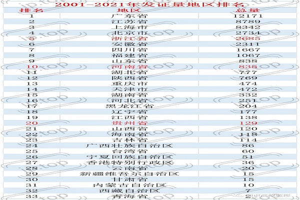 三、地区排名 截止至2021年12月31日,通过龙图腾IPTOP知识产权平台的集成电路栏目进行数据分析得到:累计发证量排名前五的地区依次为:1、广东省12171件,2、江苏省8789件,3、上海市8342件,4、北京市2734件,5、浙江省2685件;全国各地的具体的发证数据如下图所示。